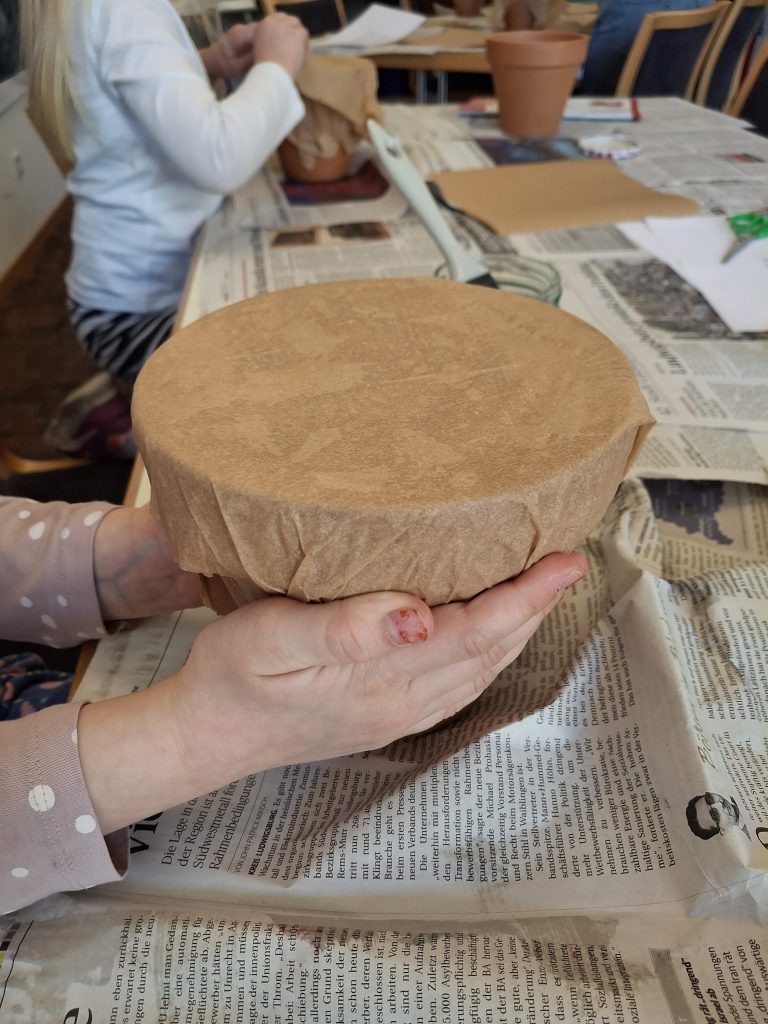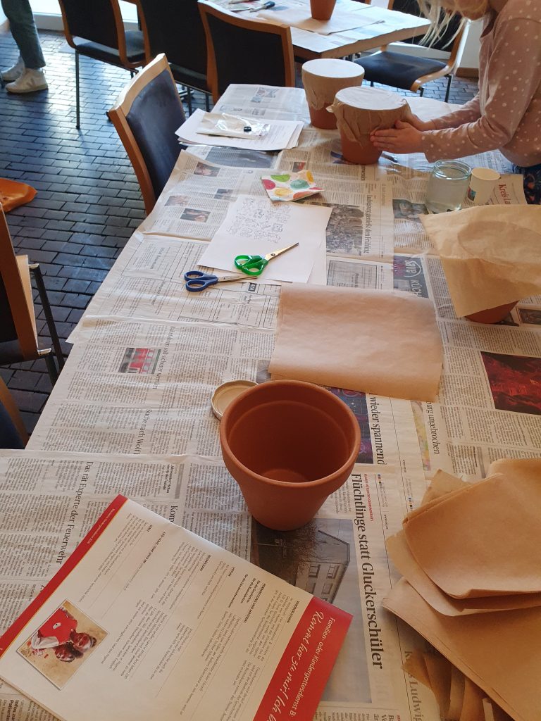 Am vergangenen Sonntag, dem Weltgebetstag, haben wir uns in großer Runde im Gartensaal zur Kinderkirche getroffen. Unser Thema war eine Reise nach Nigeria. Zuerst hat uns das Flugzeug nach Afrika gebracht. Nach der Landung in Nigeria haben wir uns die Menschen, Kinder, Tiere angeschaut und den Fluss Niger, welcher fast das ganze Land von Nord nach Süd durchzieht. Außerdem konnten wir ein Kokosgebäck mit dem Namen Shuku Shuku kosten, zusammen mit einem Hibiskustee (Zobo Drink). Es gab dazu schöne nigerianische Lieder. Und danach haben wir alle afrikanische Trommeln gebastelt. Die Grundlage hierfür war ein Tontopf, dessen Öffnung mit mehreren Lagen Backpapier überzogen wurde. Als Ergebnis bekamen wir wunderbar klingende Trommeln.